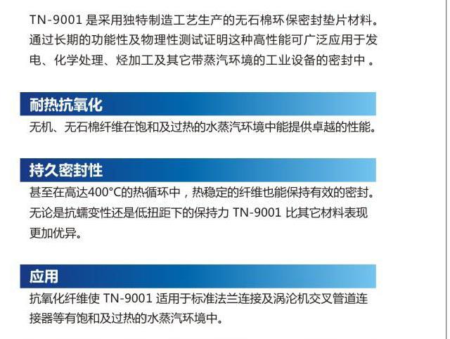 TN-9001是采用獨特制造工藝生產的無石棉環保密封墊片材料,通過長期的功能性與物理性測試證明這種高性能可廣泛應用于發電、化學處理、烴加工及其它蒸汽環境的工業設備的密封中。