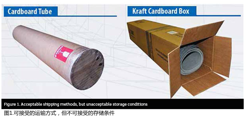 請注意,特別是對于彈性體粘合纖維片材,盡管盒子和紙管是經批準的以卷材形式運輸片材的方法,但它們不應在任何情況下用作長期存放(參見圖1)。